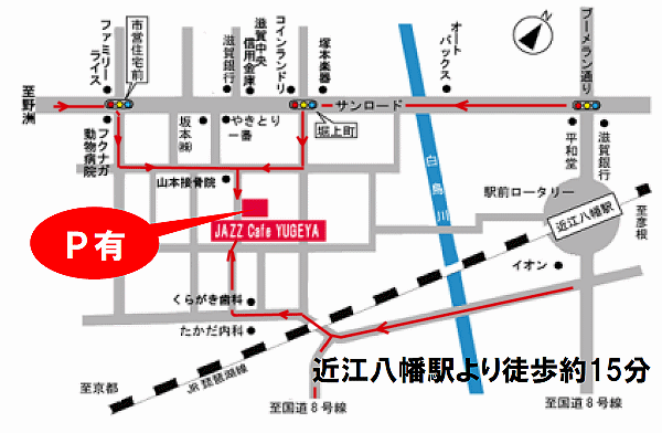 JAZZ Café YUGEYAの地図は上記の略図かGoogle Map/Street View をご利用ください。JR琵琶湖線近江八幡駅より徒歩でおよそ15分です。
